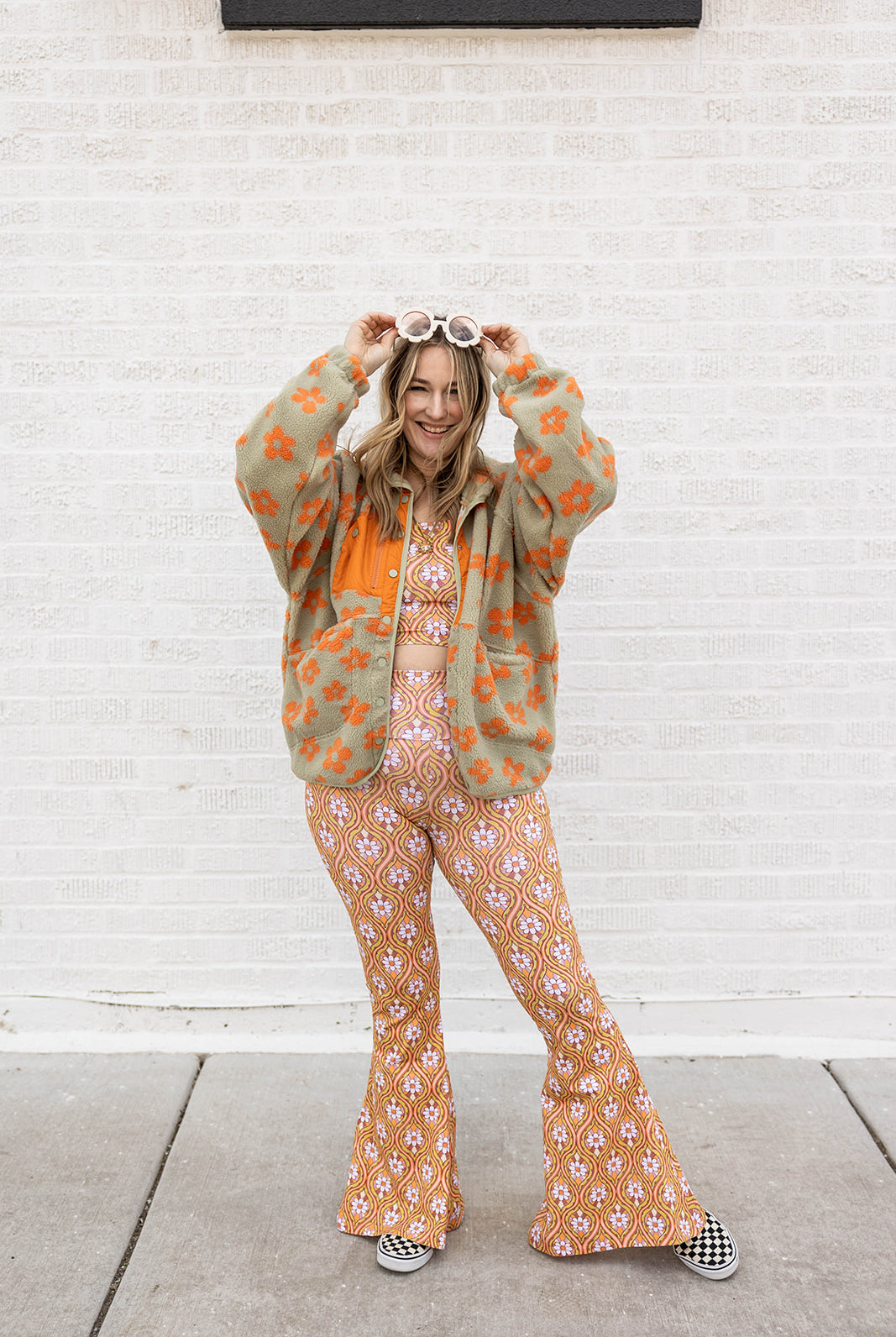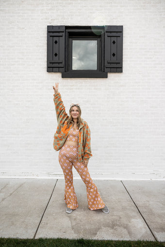 elevate your style with our estelle pant in stay groovy daisy. featuring the beloved flared fit, these pants add a touch of spring with the daisy pattern. mix and match with our lilac velvets, a graphic tee, or our stay groovy hooded sweatshirt for endless groovy looks.