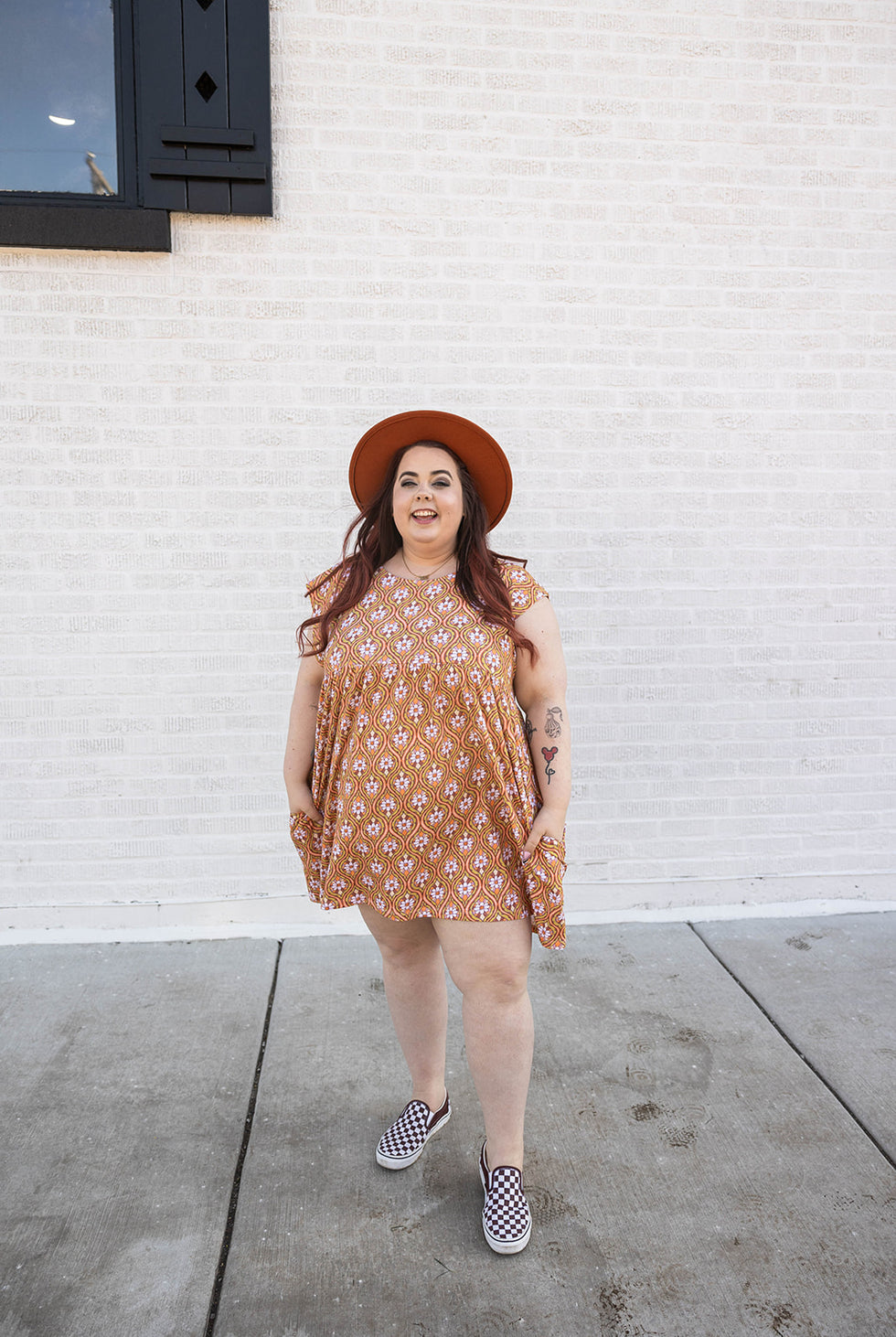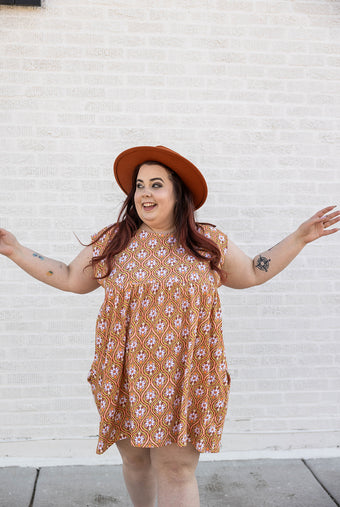look groovy and stylish with the misty dress in stay groovy daisy! this free-flowing empire waist dress not only screams style, but also offers the convenience of pockets. the perfect dress for any occasion with its bright daisy print. get yours now and make a statement!